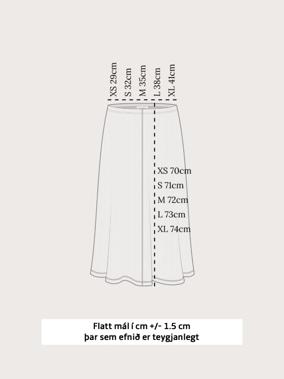 Merino ullarpils í þægilegu A sniði með teygjanlegu mitti. Þetta 100% merino ullarpils er yndislega mjúkt og er með fínni "rib knit" áferð sem gerir það teygjanlegra og endingarbetra. Merinoull er þekkt fyrir einstaka mýkt, hlýju og öndun.