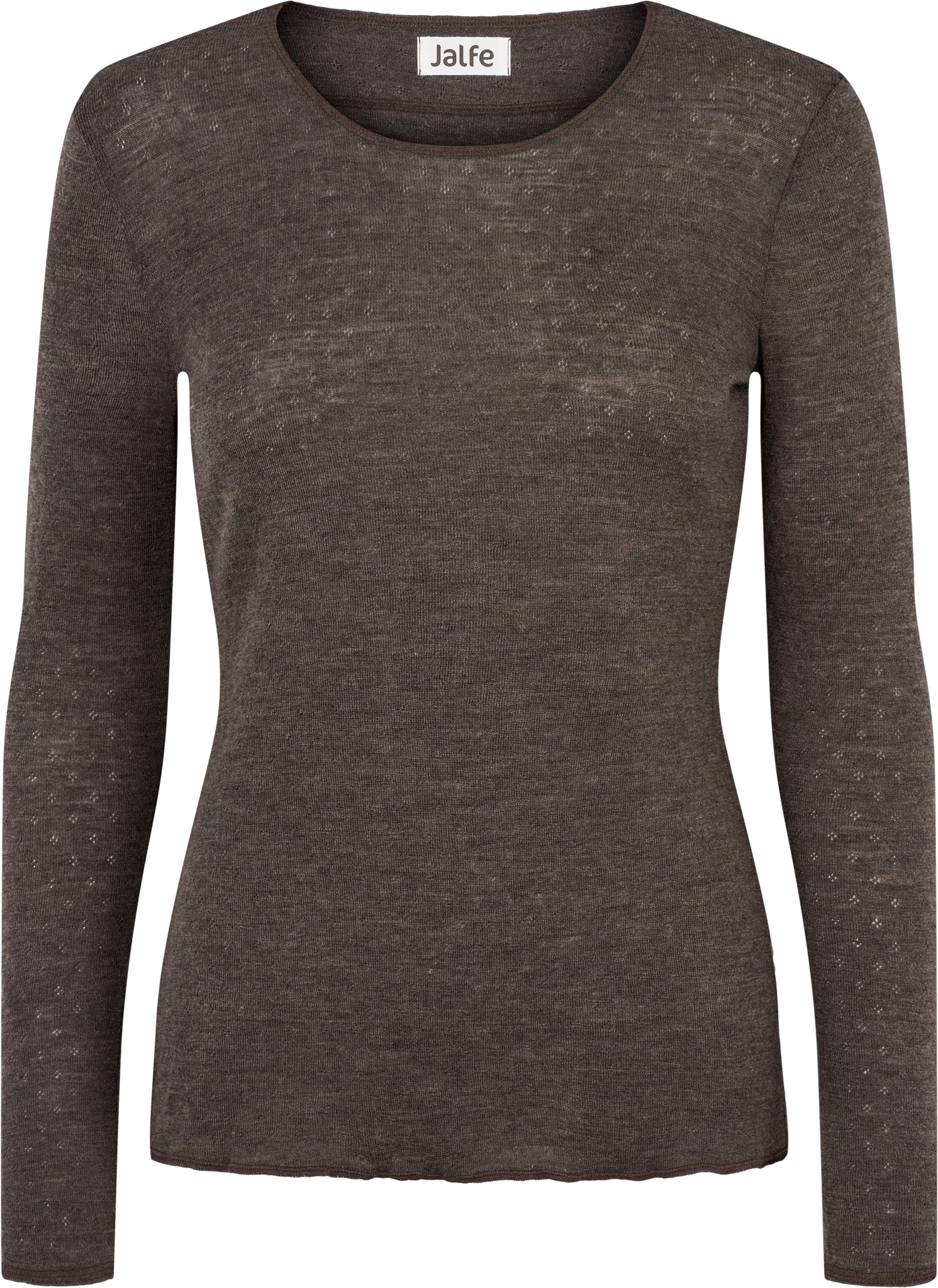 Merino ullarbolur með bátalaga hálsmáli. Þessi 100% merino ullarbolur er yndislega mjúkur og er með fínni "eyelet" prjónaáferð. Merinoull er þekkt fyrir einstaka mýkt, hlýju og öndun.
