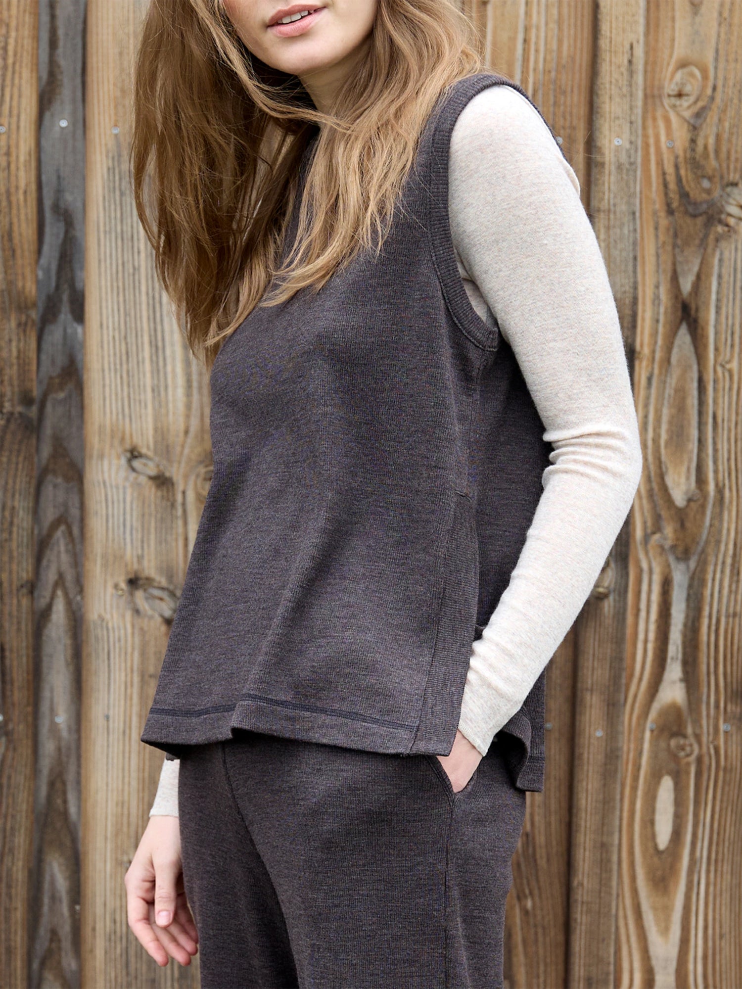 Merino ullarvesti með klaufum á hliðum. Þetta 100% merino ullarvesti er yndislega mjúkt og er með fínni "rib knit" áferð sem gerir það teygjanlegra og endingarbetra. Merinoull er þekkt fyrir einstaka mýkt, hlýju og öndun.